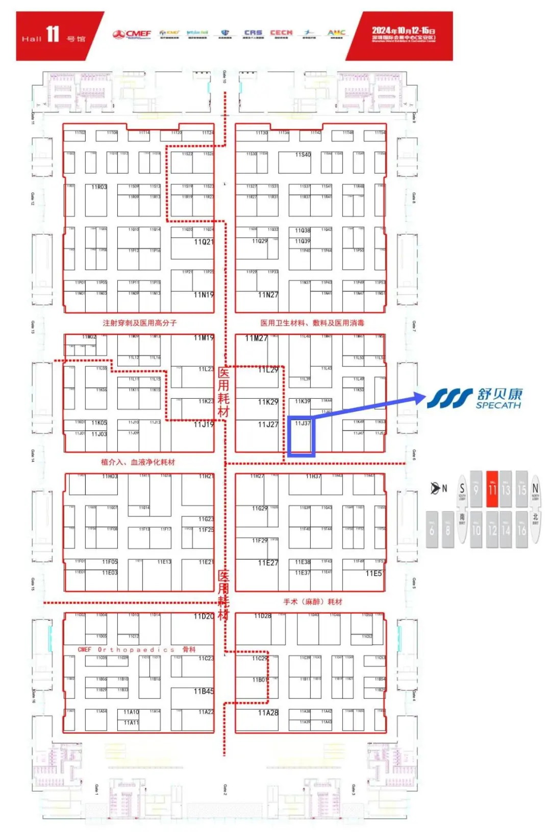 1. 展位指引 下圖藍框標(biāo)注為舒貝康展位區(qū)域:11號館J37展位。